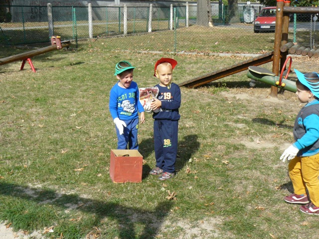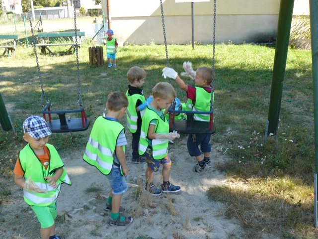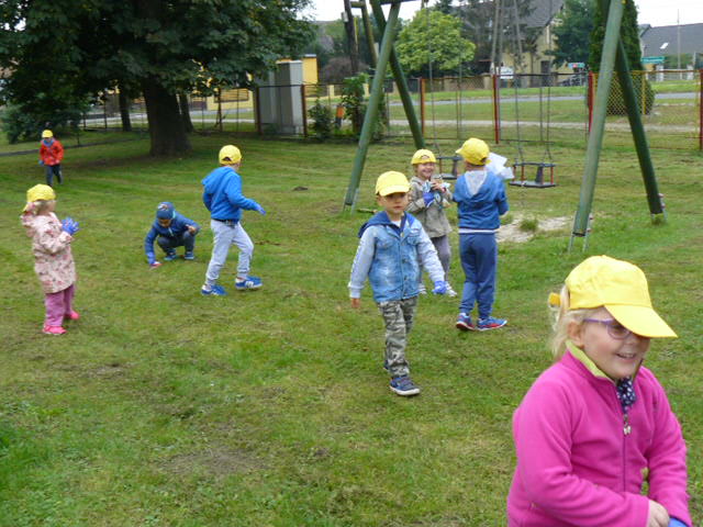 " Słońce świeci przedszkolaki segregują śmieci". Jednak główną atrakcją tego dnia było sprzątanie placu zabaw. Dzieci ze swoich obowiązków wywiązały się znakomicie!