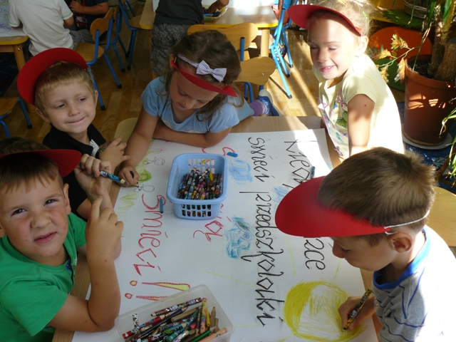 20 września 2013 r. dzieci z PP w Krzyżowicach uczestniczyły w akcji "Sprzątania Świata 2013". Celem tej kampanii jest nie tylko doraźne usunięcie śmieci z naszego otoczenia, ale przede wszystkim wzrost świadomości i zainspirowanie społeczeństwa do działań zmierzających do poprawy środowiska naturalnego. Nasze działania w tym zakresie rozpoczęliśmy od zajęcia, którego temat brzmiał:"Segregujemy śmieci w przedszkolu". Dzieci rozpoznawały materiał z jakiego wykonany jest odpad, poznały kształt i kolor pojemników do segregacji. Samodzielnie segregowały odpady do właściwych pojemników. Po czym każdy przedszkolak wykonał pracę plastyczną, kolorując pojemniki do segregacji śmieci uwzględniając przyjętą kolorystykę. Następnie dzieci przystąpiły do zbierania śmieci w wokół naszego przedszkola, głośno skandując słowa wiersza: "Papier, puszki, szkło, plastiki, posprzątamy w pojemniki. Posprzątamy sprawnie, pięknie,bo nam świat przez śmieci pęknie".