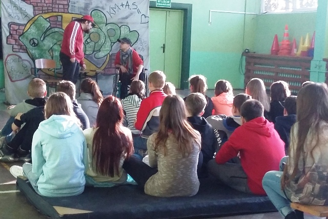 Tak brzmiał tytuł spektaklu przedstawionego przez przez Teatr Profilaktyczny z Krakowa, który 14 grudnia obejrzeli gimnazjaliści z Olszanki. Akcja przedstawienia rozgrywa się w miejskim parku. Do odpoczywającego mężczyzny na wózku inwalidzkim podbiega diler, uciekający przed policją. Udaje mu się zmylić pościg, a między mężczyznami wywiązuje się dyskusja. Pozornie nic ich nie łączy, nie mają wspólnych zainteresowań, mężczyzna na wózku widocznie góruje nad przypadkowym znajomym inteligencją, jest świetnym szachistą. Usiłuje pokazać, że pomimo kalectwa jego życie jest ciekawe, aktywne. Wózek w żaden sposób go nie ogranicza, chodzi na dyskoteki, robi zakupy, nie siedzi zamknięty w domu. Pozornie wszystko jest w porządku. Tylko te twarze...