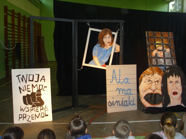 Za pomocą wielu rekwizytów- sugestywnych plakatów, pięknej, przejmującej muzyki, ciemnej kolorystyki ukazana została problematyka przemocy w rodzinie, której ofiarami bywają najczęściej dzieci. Aktorzy w sposób metaforyczny uświadomili wszystkim, że nie należy być obojętnym wobec krzywdy, jakiej doświadczają dzieci, w których domach dominuje przemoc, alkoholizm, bezduszność i okrucieństwo, gdzie nie ma miłości, odpowiedzialności, zaufania i poczucia bezpieczeństwa. Na nas dorosłych, sąsiadów, nauczycieli spoczywa obowiązek reagowania na każdą krzywdę dziecka.
