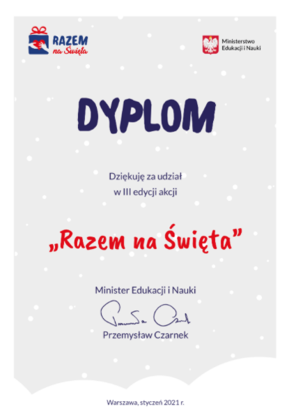 Ponad 12 tys. szkół, przedszkoli i placówek oświatowych z całego kraju wzięło udział w akcji Ministerstwa Edukacji Narodowej „Razem na Święta”. To rekordowa liczba zgłoszeń. Uczniowie i nauczyciele wspólnie organizowali zbiórki darów dla potrzebujących, śpiewali kolędy, przygotowywali kartki z życzeniami oraz świąteczne upominki dla osób starszych i samotnych z najbliższej okolicy. Swoimi działaniami udowodnili, że pomagać można niezależnie od okoliczności. Dziękujemy za tak liczny udział w akcji i dobro okazane drugiej osobie!