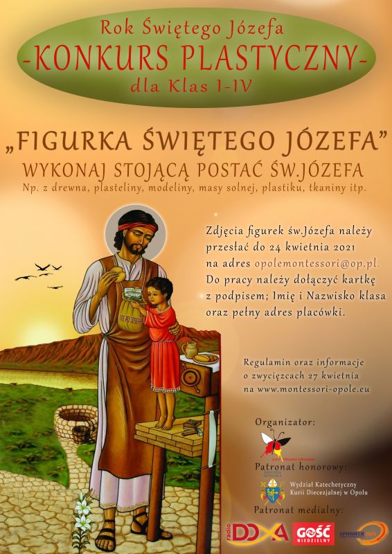 1. Organizatorem konkursu jest Zespół Szkolno-Przedszkolny Stowarzyszenia Pro Liberis Silesiae w Opolu. 2. Konkurs adresowany jest do uczniów kl. I – IV. 3. CELE: -Przybliżenie osoby św. Józefa -Promowanie wartości chrześcijańskich w codziennych sytuacjach życiowych wzorowanych na postaci św. Józefa -Promowanie wartości rodziny w życiu każdego człowieka. -Rozwijanie umiejętności plastycznych, technicznych oraz pomysłowości i kreatywności dzieci. 4. Zadaniem uczestników konkursu jest wykonanie figury stojącej postaci św. Józefa. Do wykonania pracy można wykorzystać np.: modelinę, plastelinę, ciastolinę, masę solną, glinę, mydło, świecę, plastik, tkaniny, masę papierową, drewno, … 5. Konkurs trwa od 07.04.2021 r. do 24.04.2021 r. 6. Zdjęcia figurek św. Józefa należy przesłać do 24 kwietnia 2021 na