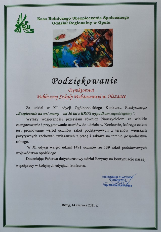 Dnia 2 czerwca 2021 na Zamku Piastów Śląskich w Brzegu, miała miejsce uroczystość wręczenia nagród uczestnikom XI Ogólnopolskiego Konkursu Plastycznego dla Dzieci „Bezpiecznie na wsi mamy – od 30 lat z KRUS wypadkom zapobiegamy”. Do tegorocznego konkursu przystąpiło 43 234 uczniów z 3 744 szkół podstawowych z terenów wiejskich. Zadaniem uczestników było wykonanie pracy plastycznej w dowolnej technice w formacie