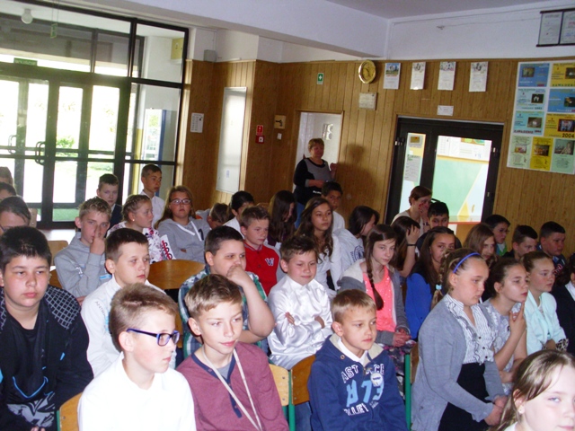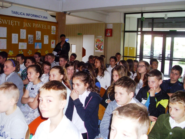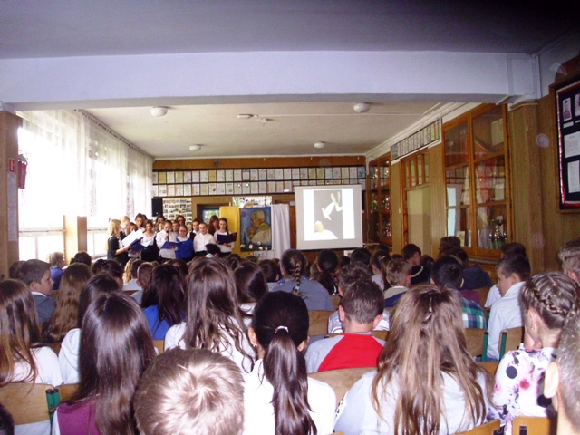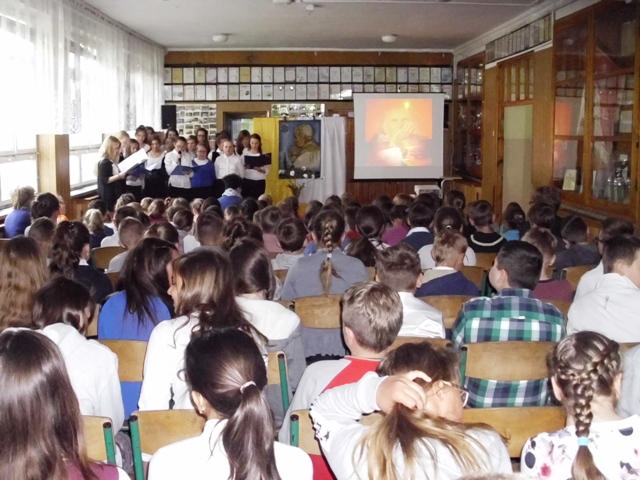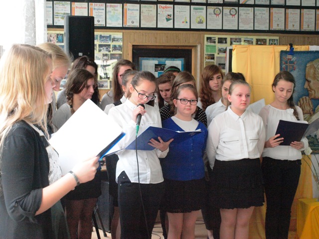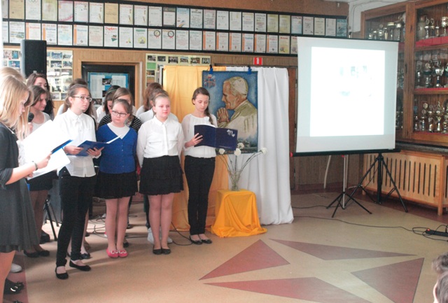 Montaż słowno – muzyczny uczniowie PZSP zaprezentowali również społeczności szkolnej oraz nauczycielom w czwartek 30 kwietnia 2015 r. Akademię rozpoczęto od wzruszającego wykonania piosenki “Abba Ojcze”, w trakcie której część uczniów złożyła symbolicznie białe goździki przed portretem Jana Pawła II. Następnie prowadzący akademię, w tej roli m.in. Paulina Hain, Paulina Farganus, Magdalena Zalewska, na przemian z recytatorami: Sylwią Barwińską, Kamilą Kadłubowską, Dagmarą Urban oraz Martę Kaletę. opowiadali o niezwykłym życiu Papieża- Polaka. Widzowie mogli usłyszeć wzruszającą poezję w wykonaniu młodych artystów. Słowo mówione doskonale dopełniała prezentacja multimedialna, przypominająca najważniejsze momenty z życia naszego Papieża. W programie recytacja przeplatała się z pięknym śpiewem szkolnego chóru, który wykonał takie pieśni jak: ”Moje miasto Wadowice”, “Barka”, “Abba Ojcze”,a także współczesne utwory opiewające postać Papieża. Tematyka apelu zainteresowała wszystkich zebranych, którzy w ogromnym skupieniu wsłuchiwali się w słowa występujących. Momentem szczególnie poruszającym było odśpiewanie przez uczennice gimnazjum: Magdalenę Zalewską, Kingę Jastrzębską i Kamilę Kadłubowską - piosenki “Zaufaj Panu”. Punktem kończącym uroczystości, upamiętniające postać Papieża, była pieśń pt.”Leć muzyczko” wykonana przez chór szkolny. Spotkanie było naprawdę piękne i oczyszczające, pełne zadumy, niespieszne, podniosłe, trafiające do serc oglądających.