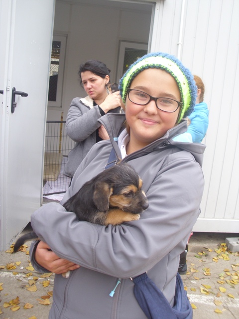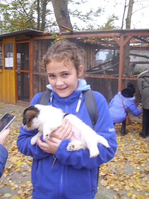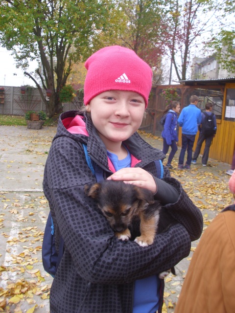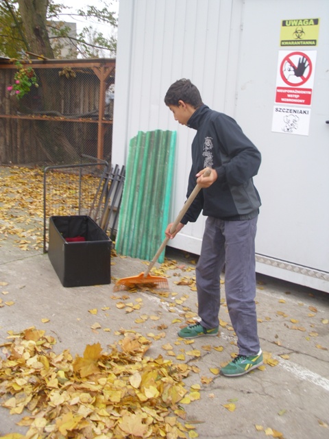 i bardzo mocno się przywiązują do ludzi. Opowiadała o swoich psich i kocich podopiecznych, w jaki sposób trafili do Przytuliska, co przeżyli w swoim życiu i czego doświadczyli. Niektóre historie były bardzo smutne. Dzieci zrozumiały, że posiadanie psa czy kota, to nie tylko przyjemność, ale także obowiązek wobec niewątpliwie słabszej istoty. Pani opiekun przypomniała także, jak wielką odpowiedzialnością jest opieka nad zwierzęciem przez całe jego życie. Następnie każdy chętny mógł potulić szczeniaczka, pogłaskać, przytulić, podrapać za uchem czy po grzbiecie psa, była to duża frajda zarówno dla dzieci jak i przede wszystkim czworonogów. Co silniejsi chłopcy (Michał Majcher, Adam Kopij, Marcin Świtoń, Emanuel Drebschok) mogli pomóc także poprzez uporządkowanie jesiennych liści z terenu Przytuliska, z czego wywiązali się znakomicie.