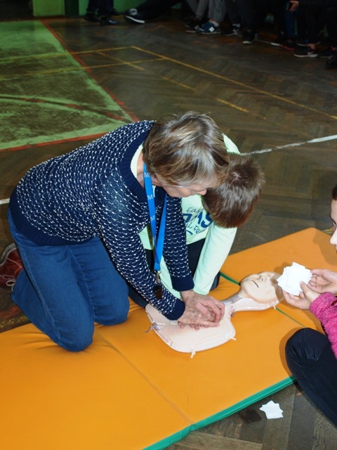 Nasza szkoła oczywiście wzięła odział w akcji. W poniedziałkowe południe, kilka minut przed 12 wszyscy uczniowie, zarówno PSP jak i PG, zgromadzili się w sali gimnastycznej, gdzie czekały na nich przygotowane fantomy . Pani Ania Kasków, koordynatorka akcji, powiedziała kilka słów na temat konieczności znajomości przeprowadzania akcji reanimacyjnej oraz przypomniała zasady postępowania w takiej sytuacji. Dokładnie o 12 głośnym gwizdkiem dała znak do rozpoczęcia akcji. Najpierw ochoczo przystąpili do pokazu uczniowie PSP, nawet ci najmłodsi, bo z I klasy. Już po chwili wszystkie fantomy były oblegane. Gimnazjaliści trochę się krępowali, bali reakcji kolegów, ale szybko przełamali opory i już po chwili widać było pochylone postacie rytmicznie odliczające do 30. Przez pół godziny 200 uczniów starało się, na razie oczywiście na próbę, przywrócić komuś życie.