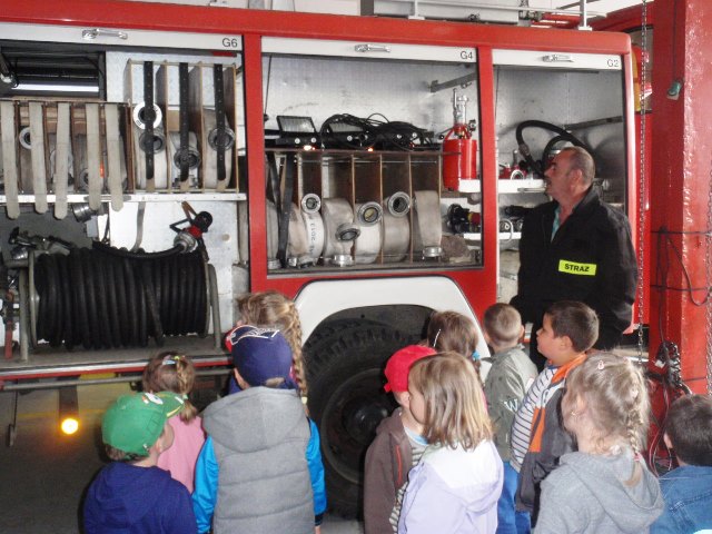 19 maja 2015 r. odwiedziliśmy Ochotniczą Straż Pożarną w Olszance. Na wycieczce został zaprezentowany sprzęt pożarniczy stanowiący wyposażenie jednostki Straży Pożarnej. Oglądaliśmy wozy strażackie, sprzęt do gaszenia pożarów. Dzieci mogły usiąść za kierownicą, przymierzyć hełm strażacki, spróbować potrzymać wąż strażacki. W formie pogadanki dzieci zapoznały się z zadaniami realizowanymi przez straż pożarną, sposobami alarmowania oraz zachowania się w przypadku zagrożenia. Dzieci utrwaliły sobie numer telefonu do Straży Pożarnej - 998 i numer alarmowy – 112. Na zakończenie dzieci otrzymały od strażaków pamiątkowe gadżety i cukierki, natomiast dzieci wręczyły strażakom laurkę z okazji ich święta.