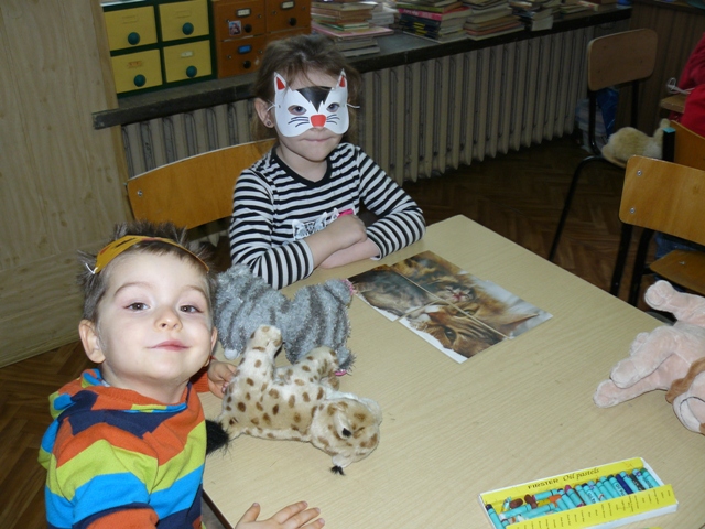 Było wiele kocich zabaw dydaktycznych i ruchowych, „miauczące” piosenki oraz konkurs plastyczny. Prace były naprawdę piękne, pomysłowe, wykonane różnymi technikami. Na zakończenie dzieci podziękowały Pani Esterze za przeprowadzenie interesujących zajęć, wręczając kolory dyplom. Po czym maluszki obejrzały bajkę pt:" Kot Filemon".