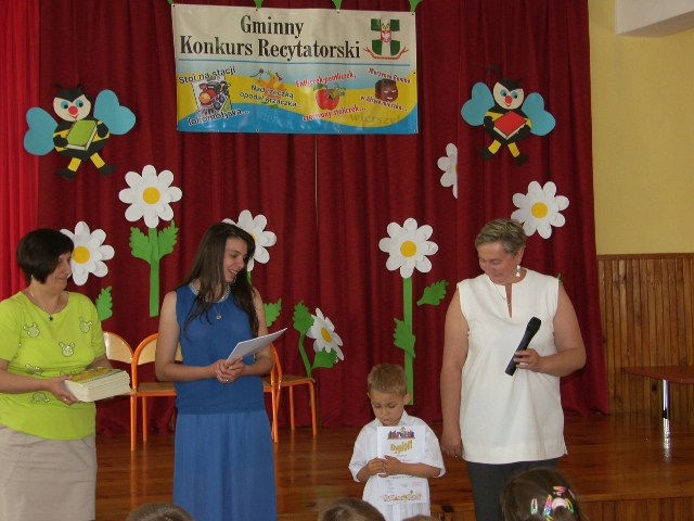 Dnia 15 czerwca 2016r. odbyła się kolejna edycja Międzyprzedszkolnego Konkursu Recytatorskiego. Wiersze recytowane przez naszych małych artystów były ciekawe i barwnie zaprezentowane.Wyniki konkursu: I miejsce - Oliwa Zeman II miejsce - Anita Demków III miejsce - Julia Sagan III miejsce - Daniel Bugiel I nasz najmłodszy uczestnik konkursu Wiktor Gąsiorowski otrzymał I miejsce . Przedszkolaki otrzymały piękne dyplomiki .Natomiast Marcel Bodniak, Hubert Krocz oraz Hubert Skorochoda kolorowe książeczki.Gratulujemy!