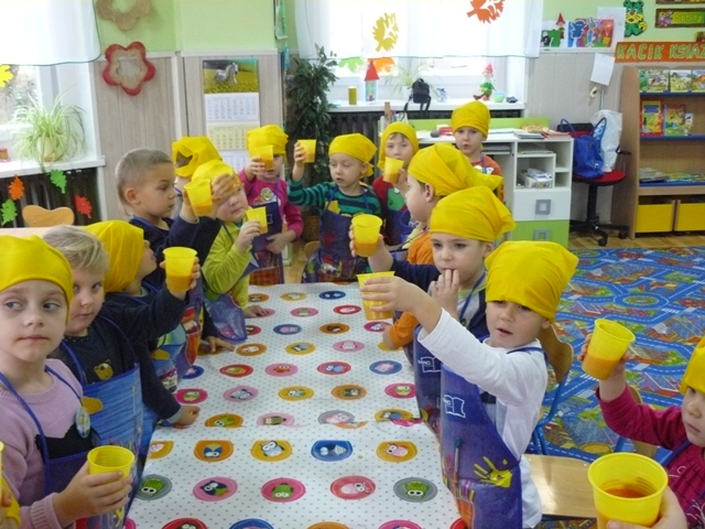 Dzieci z PP w Krzyżowicach wiedzą, że aby być zdrowym trzeba się dobrze odżywiać, a najwięcej witamin mają owoce i warzywa. Dlatego z myślą o pysznych witaminkach postanowiliśmy zrobić sok bez dodatku cukru i konserwantów .Dzieci przyniosły do przedszkola marchewki, jabłka, maliny, truskawki. Jednak zanim przystąpiliśmy do pracy, zapoznaliśmy się z urządzeniem do robienia soku, czyli sokowirówką . Po czym umyliśmy dokładnie owoce założyliśmy fartuszki. Następnie pokroiliśmy owoce na mniejsze części i pozostało tylko wrzucenie składników do maszyny i sok gotowy! Wszystkim bardzo smakował samodzielnie zrobiony soczek. Była to wspaniała "witaminowa" uczta!!!