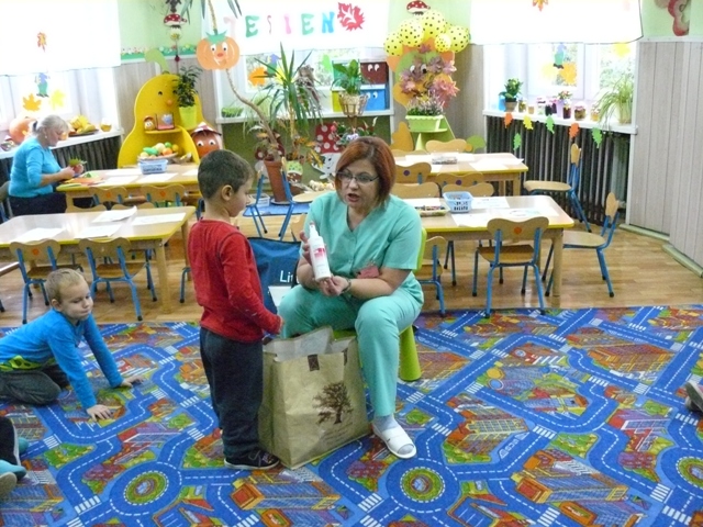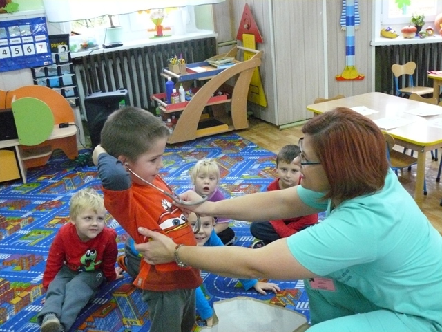 Dnia 26 października 2016 r. dzieci z PP w Krzyżowcach odwiedziła Pani Beata Kotara pielęgniarka z Wojewódzkiego Centrum Medycznego w Opolu.Celem spotkania było zapoznanie przedszkolaków z pracą pielęgniarki, ze sposobami ochrony zdrowia oraz wyrabianie nawyków prozdrowotnych. Maluszki z dużym zainteresowaniem słuchały co należy robić, aby być zdrowym. Pani Beata pokazała dzieciom narzędzia, jakie wykorzystuje w swojej pracy oraz przedmioty związane z udzielaniem pierwszej pomocy: bandaż, woda utleniona, plaster, gaza. Poinstruowała jak zachować się w sytuacji; krwotoku z nosa, oparzenia oraz uświadomiła dzieciom zakaz spożywania lekarstw.