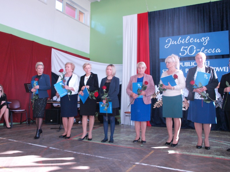 Akademia rozpoczęła się od przypomnienia historii szkoły, trudnych początków jej powstania, zmagań z przeciwnościami losu. Odtworzono także wydarzenia, które podniosły rangę placówki- nadanie szkole sztandaru w 1970 czy utworzenie hymnu przez ówczesnych nauczycieli. Ale szkoła to nie tylko mury, to także historie ludzi, z których każdy pozostawił tutaj cząstkę siebie. Uroczystą minutą ciszy i złożeniem kwiatów pod pamiątkową tablicą uczczono pamięć nieżyjących pracowników szkoły, absolwentów, członków Komitetów Rodzicielskich, Członków Komitetu Budowy. Po tej chwili refleksji nadszedł czas na uroczyste podziękowania skierowane do osób i instytucji, które wspierały szkołę w pełnieniu jej misji. Z okazji okrągłego jubileuszu 50 statuetek powędrowało do rąk tych, którym nasza szkoła jest szczególnie bliska. Osobnym dyplomem z podziękowaniami zostali uhonorowani sponsorzy. Na koniec pani dyrektor wyraziła uznanie dla wysiłku i pracy poprzednich dyrektorów i nauczycieli, którzy tworzyli tę szkołę. Nauczyciele, którzy od 30 lat czynnie wychowują kolejne pokolenia uczniów i kształtują wizerunek szkoły otrzymali pamiątkowe podziękowania.