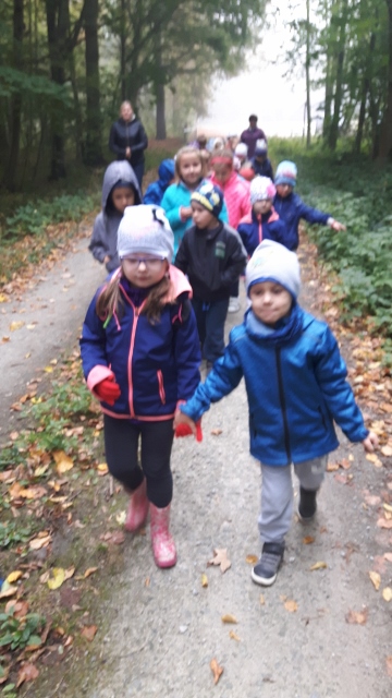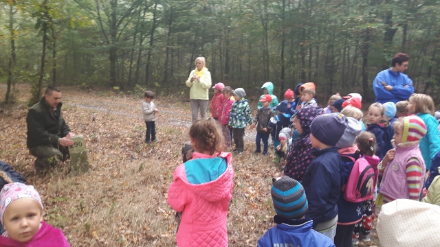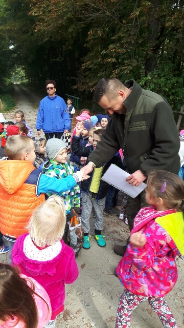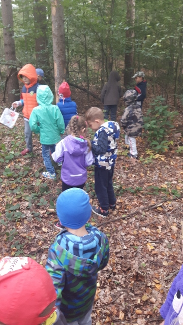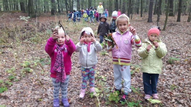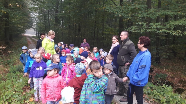 Na miejscu przedszkolaki przywitały się z pracownikiem Nadleśnictwa w Brzegu oraz z przedszkolakami z przedszkola w Przylesiu.Następnie udaliśmy się na spacer po lesie. Wycieczka do lasu była wspaniałą okazją do obserwacji naturalnego świata roślin, zwierząt, oraz wspaniałe przeżycie dla przedszkolaków. Dzieci poznawały przyrodę patrząc,słuchając i dotykając. Obserwowały las, który kryje w sobie wiele ciekawych tajemnic. Poznały różnorodność szaty roślinnej lasu: drzewa iglaste, liściaste, krzewy, mchy i runo leśne. Słuchały odgłosów lasu, a do kącików przyrodniczych zbierały "skarby", które pani Jesień zostawiła w lesie. Były to kolorowe liście (tylko te, które same spadły z drzewa), szyszki, mech, suche igły drzew iglastych, kawałki kory.