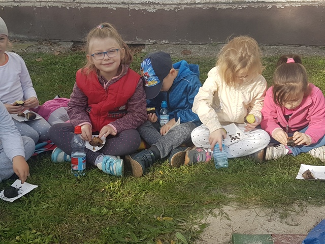 Piękna, złota, polska jesień zachęca nas do częstych zabaw na ogrodzie przedszkolnym. 18 października odbyło się Święto Pieczonego Ziemniaka. Wspólnie bawiły się wszystkie dzieci uczęszczające do naszego przedszkola. Były zawody w sadzenie i zbieranie ziemniaków, wyścig z rzutem ziemniakiem do wiaderka, a także wyścig drużyn, kto szybciej zbierze ziemniaki. Były też zabawy ze śpiewem i zabawy integracyjne. Odbyło się także także stemplowanie ziemniakami. W tym dniu nie zabrakło też pieczonych ziemniaczków, które przygotowali dla przedszkolaków chętni tatusiowie.