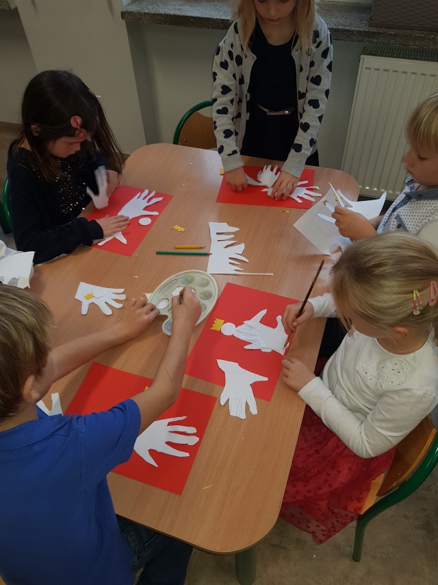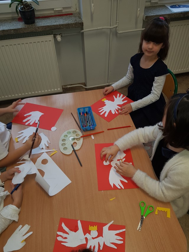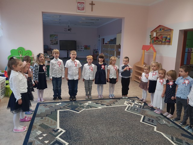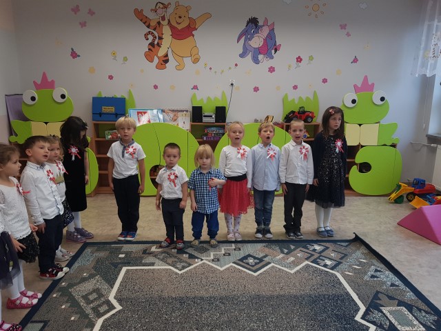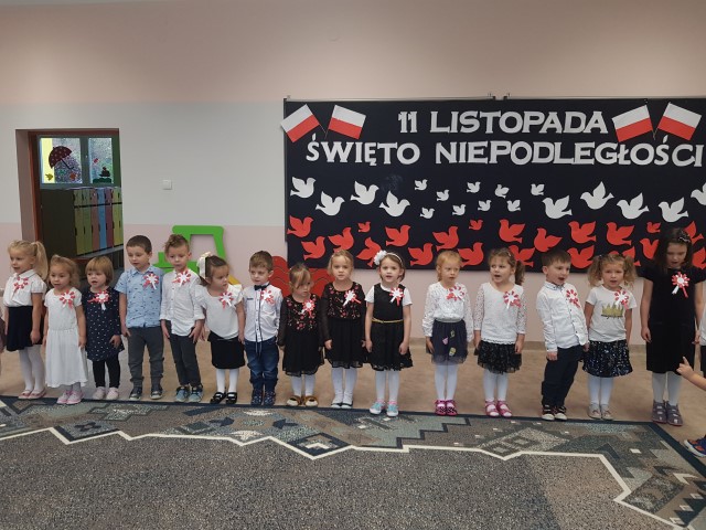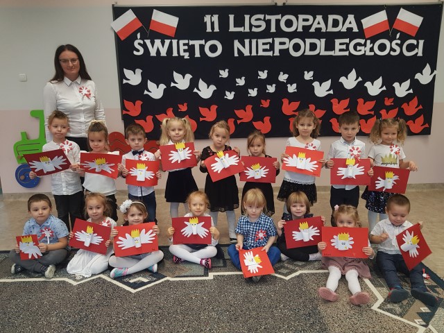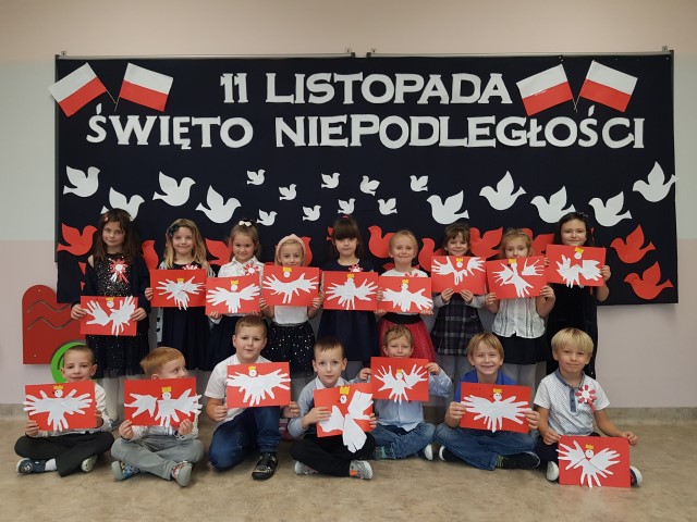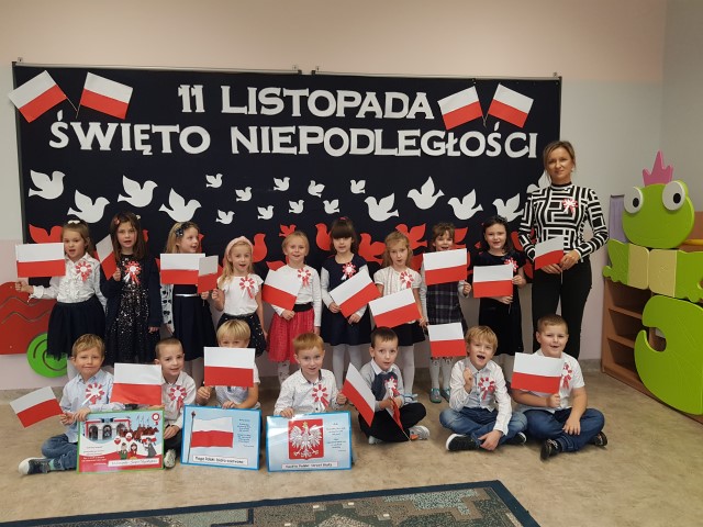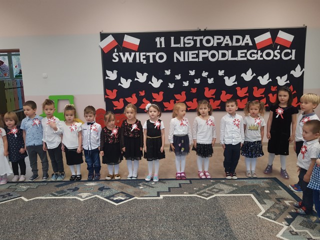 Dzień 11 listopada to jedna z najważniejszych dat w historii naszej Ojczyzny. Po wieloletniej niewoli Polska odzyskała niepodległość. W przedszkolu od najmłodszych lat uczymy dzieci patriotyzmu, przywiązania do swojej Ojczyzny, do ziemi rodzinnej, wpajamy szacunek dla polskich symboli. Dlatego też 10 listopada uroczyście obchodziliśmy Narodowe Święto Niepodległości. Wszystkie dzieci tego ważnego dnia wyglądały odświętnie i uroczyście, a na ich piersi widniały kotyliony w barwach narodowych. Dzieci poznały historię odzyskania niepodległości w oparciu o opowiadanie Doroty Baścik- Kołek pt. "Rozmowy ze starszym bratem", słuchały wierszy i pieśni patriotycznych, rozpoznawały znaki i symbole narodowe, własnoręcznie wykonały godło. O godz. 11:11 wspólnie odśpiewany został "Mazurek Dąbrowskiego".