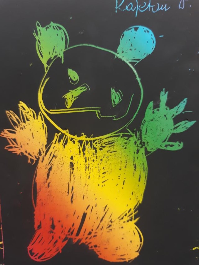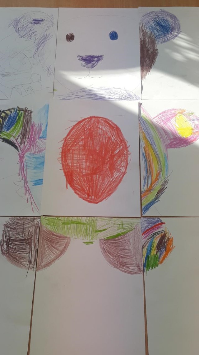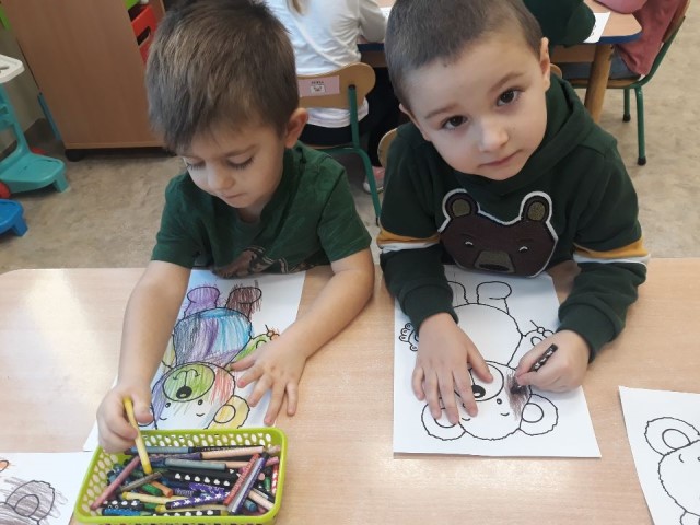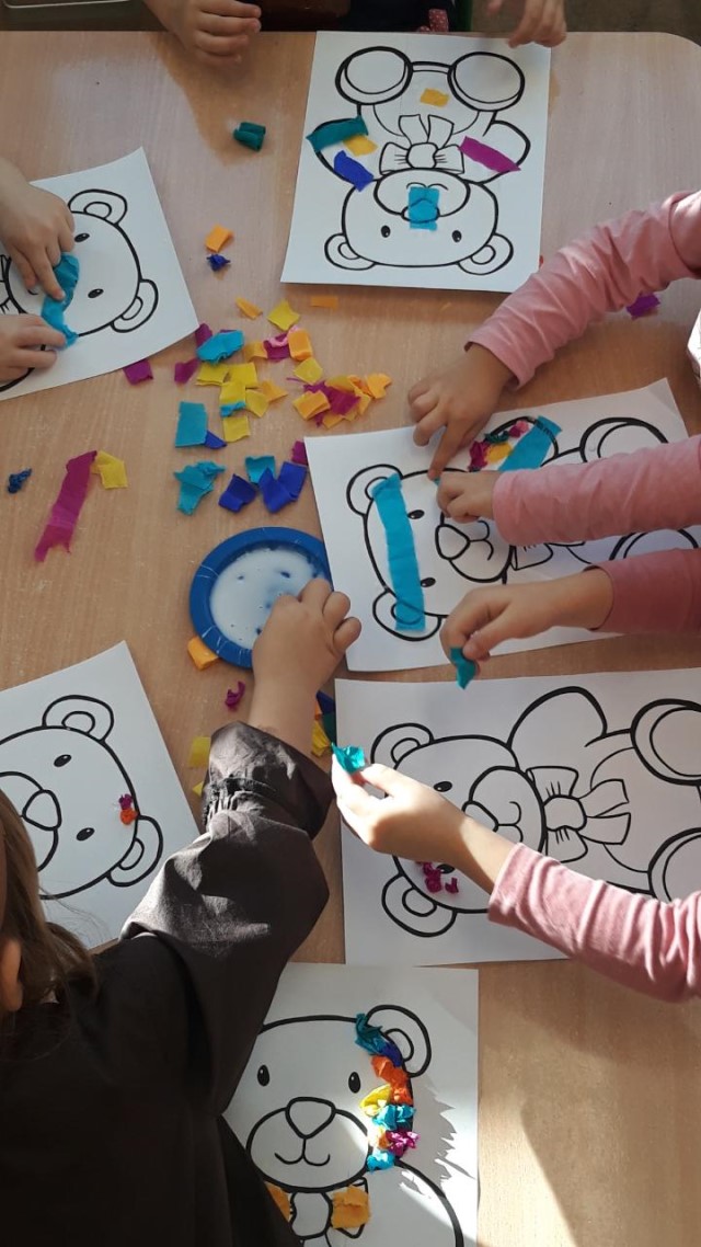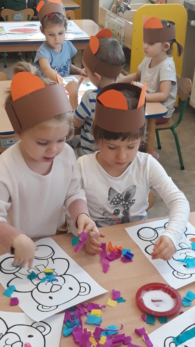 Przedszkolaki wykonały pracę plastyczną – sylwetkę misia wykleiły kolorową bibułą, ozdobiły karki wydzieranką.