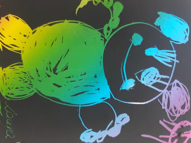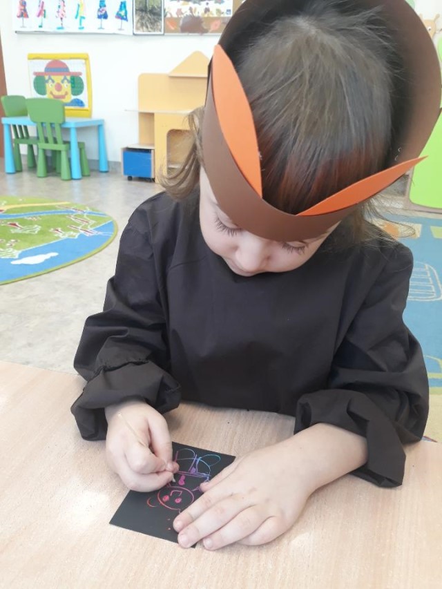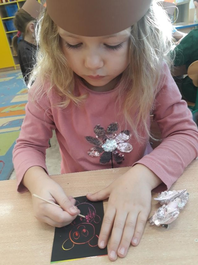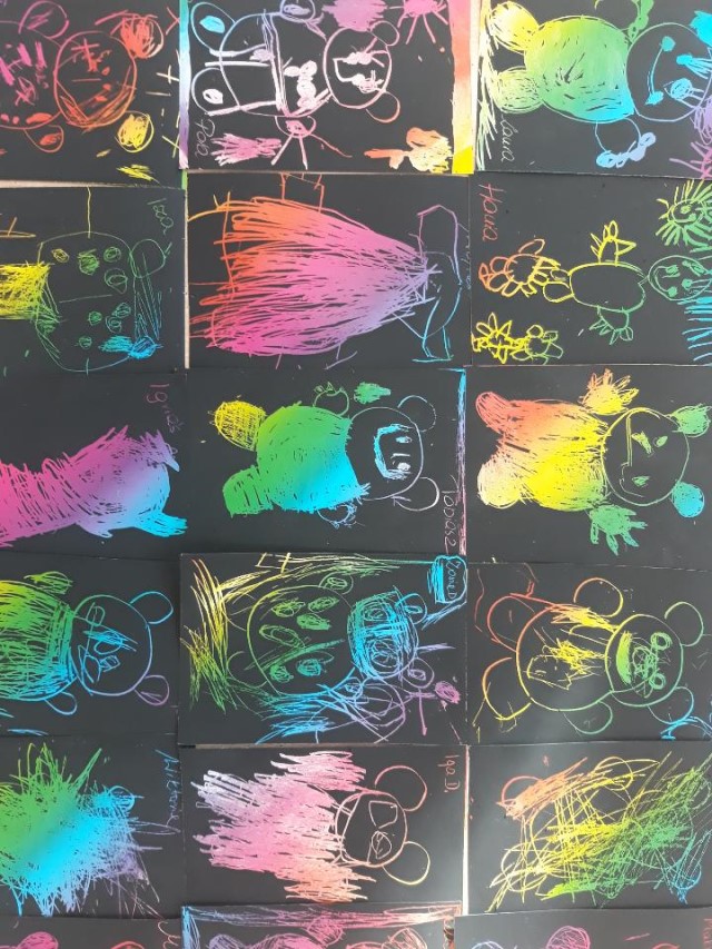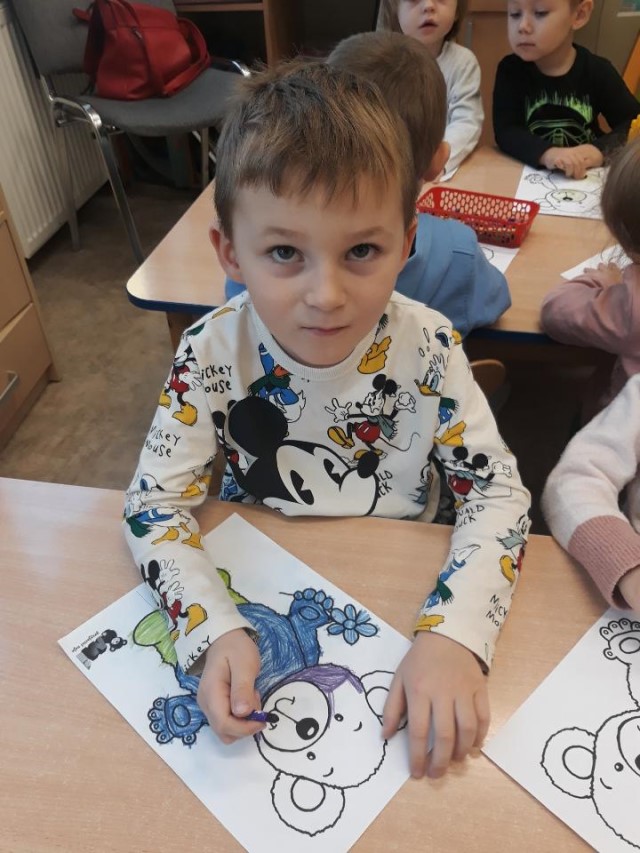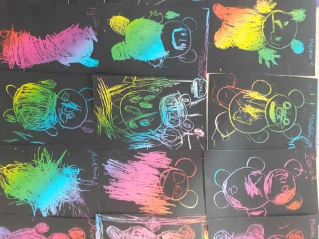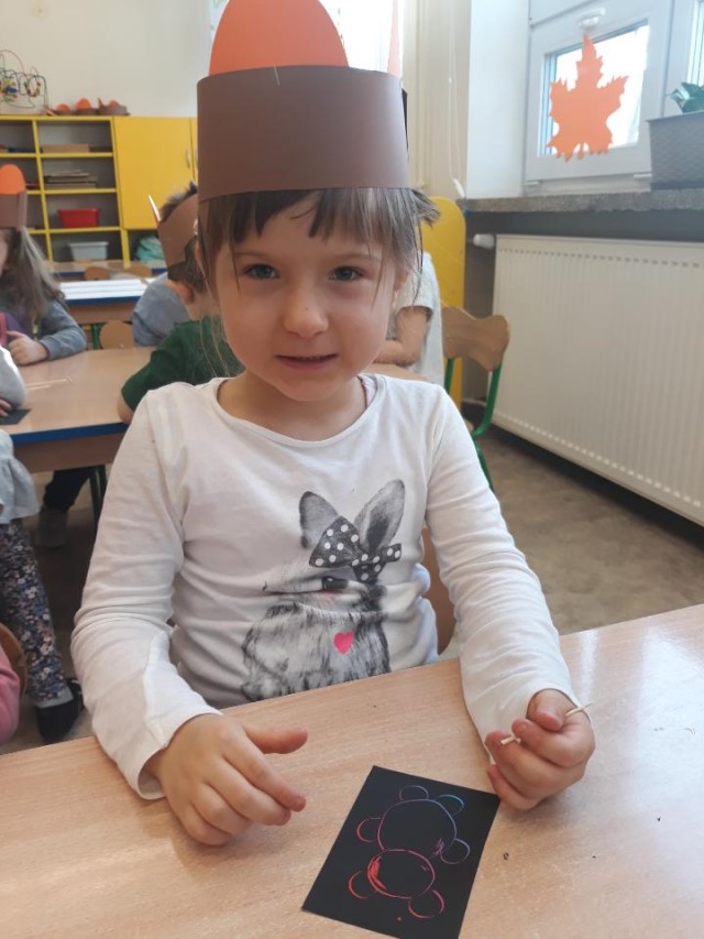 Przedszkolaki wykonały pracę plastyczną – sylwetkę misia wykleiły kolorową bibułą, ozdobiły karki wydzieranką.