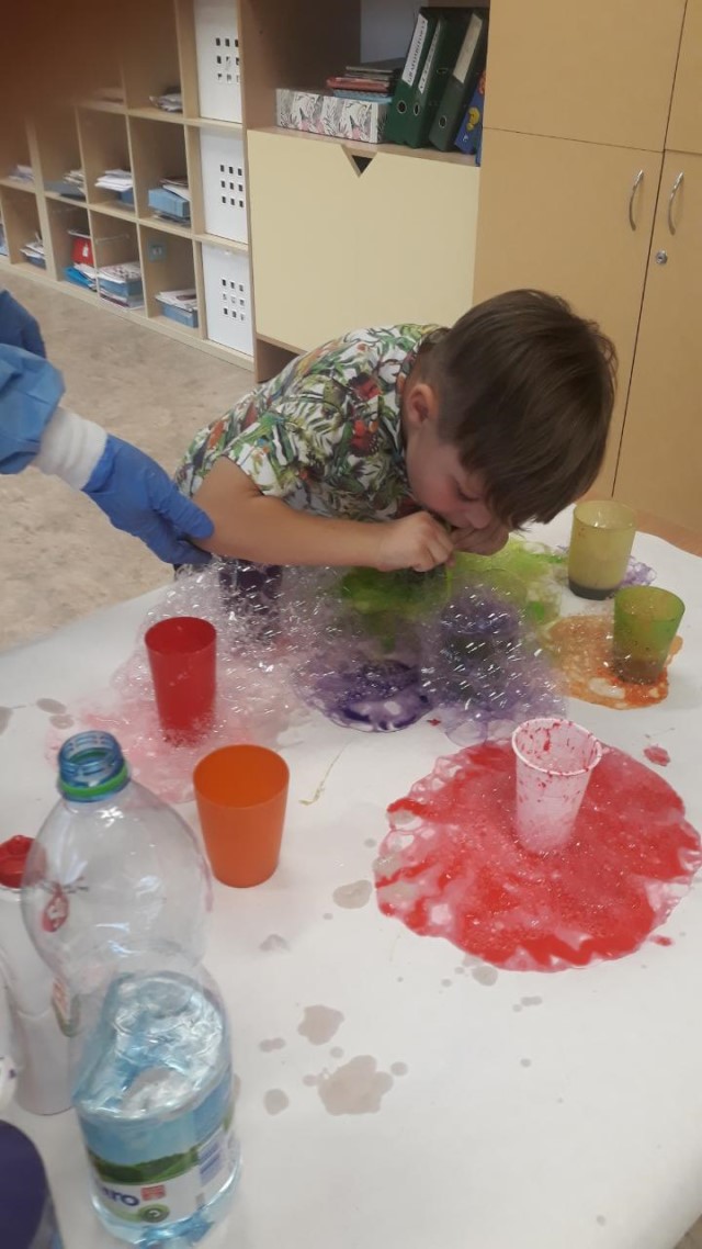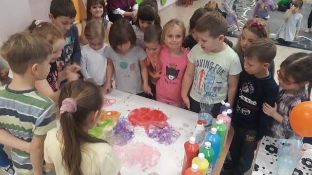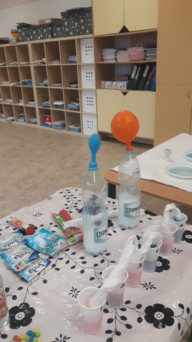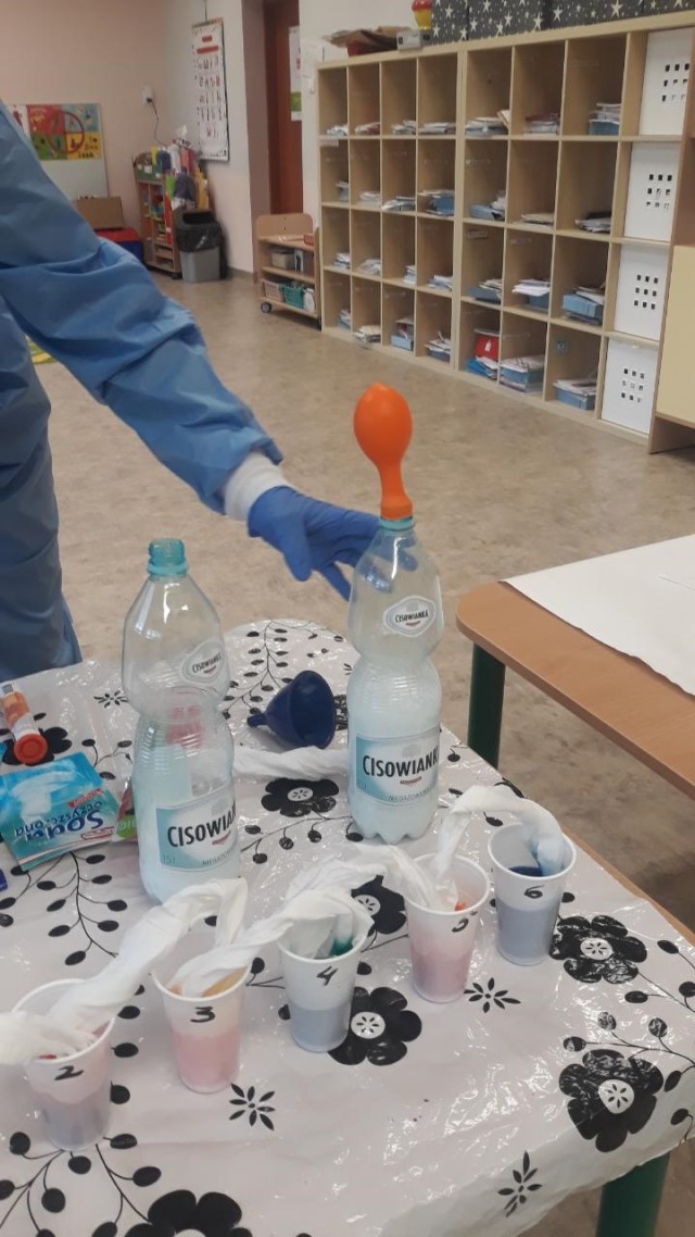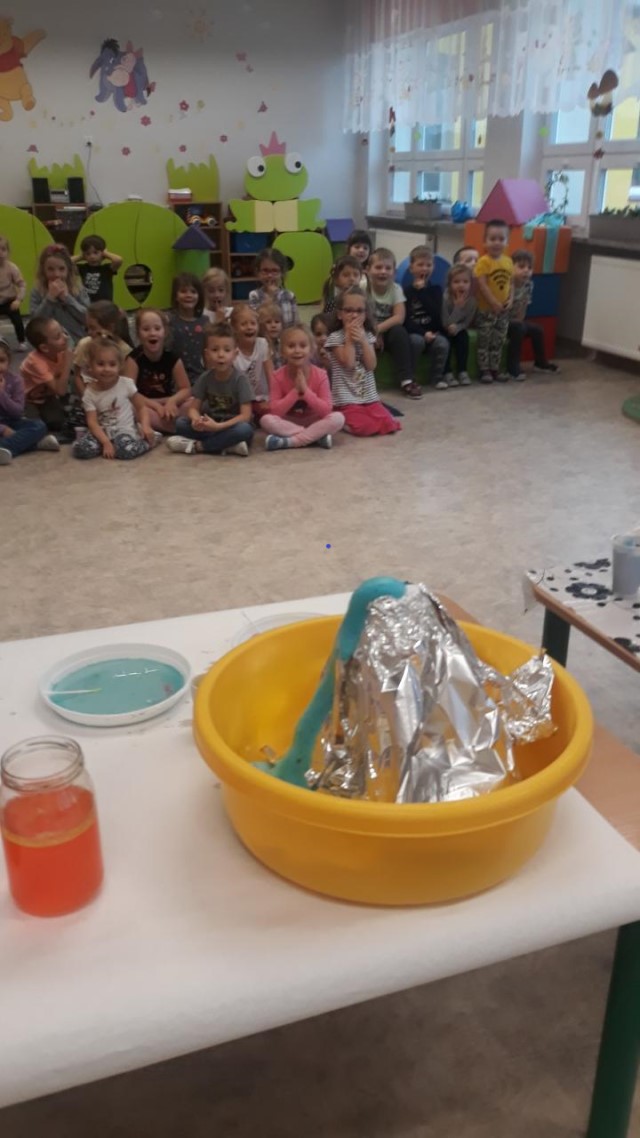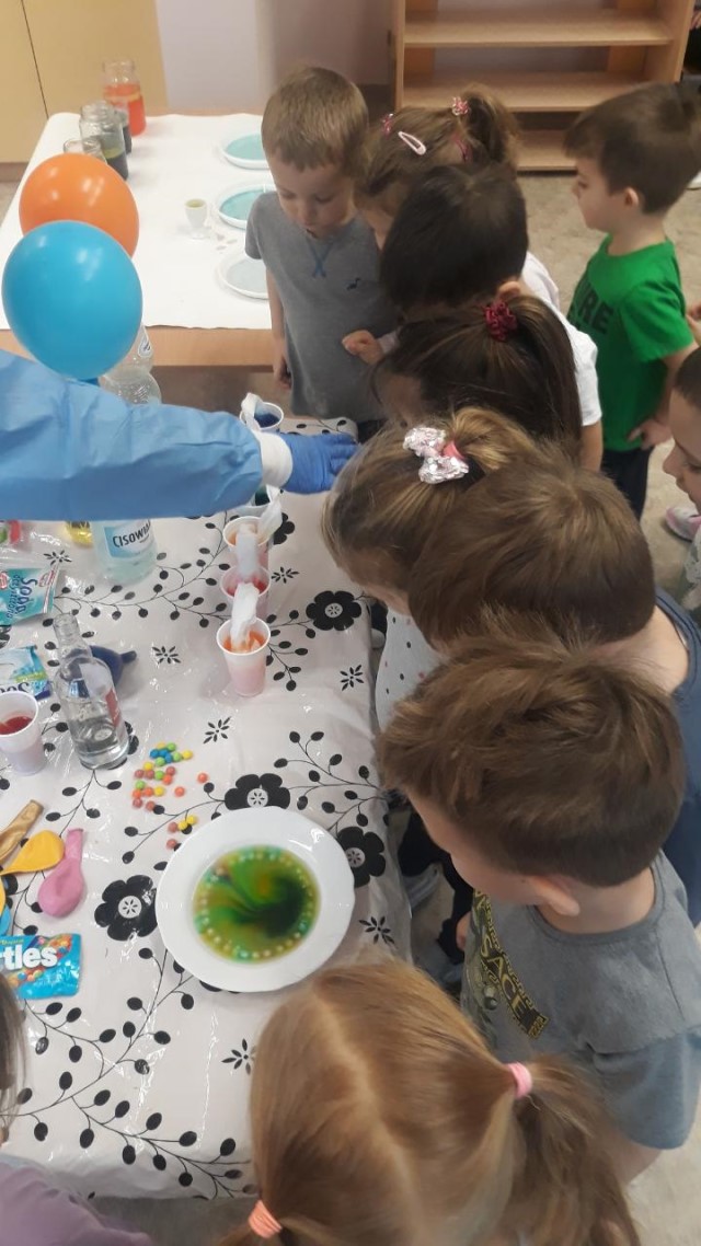 Dzieci z wielkim zaangażowaniem asystowały przy doświadczeniach o nazwach : „Wybuch wulkanu”, „Tęczowa kula”, „Samopompujący się balonik”, „Kolorowe wodne wulkany”, „Ocean w słoiczku”.