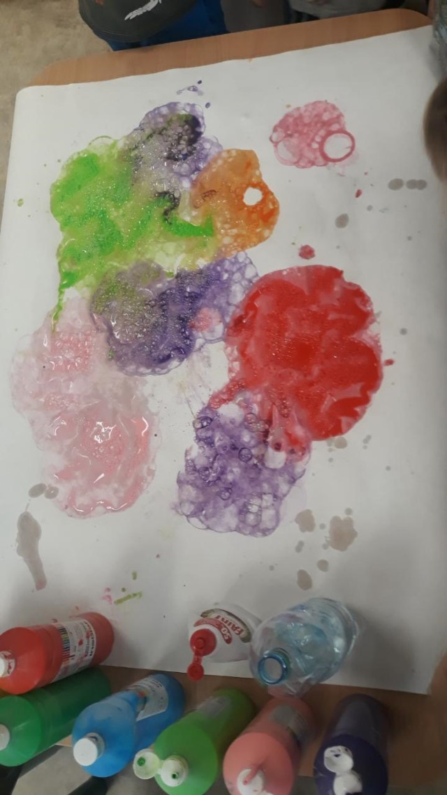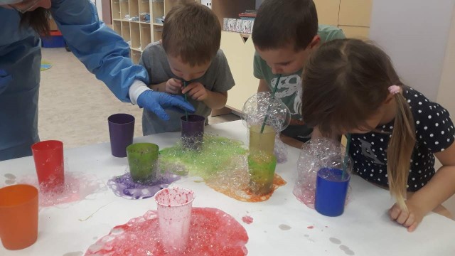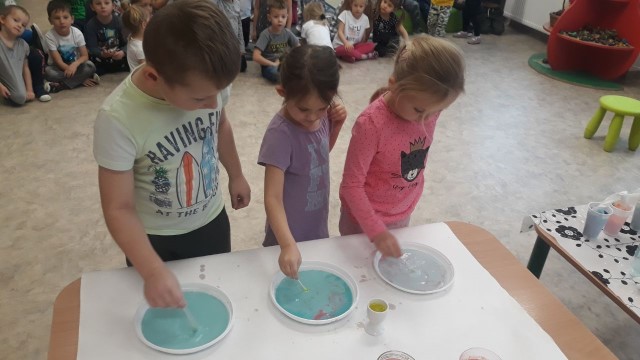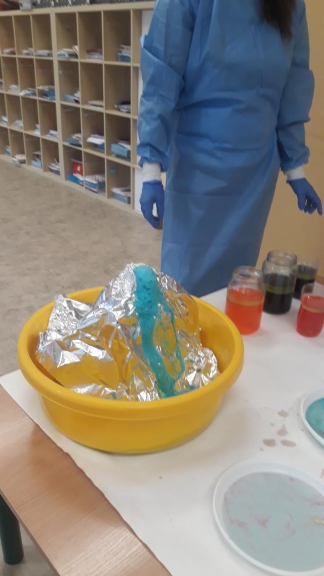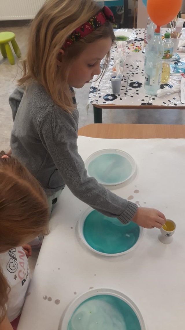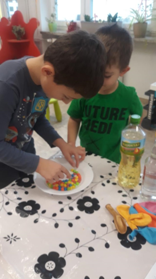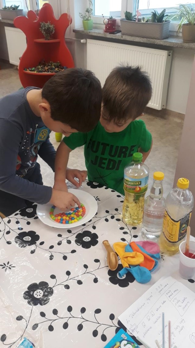 Dzieci z wielkim zaangażowaniem asystowały przy doświadczeniach o nazwach : „Wybuch wulkanu”, „Tęczowa kula”, „Samopompujący się balonik”, „Kolorowe wodne wulkany”, „Ocean w słoiczku”.
