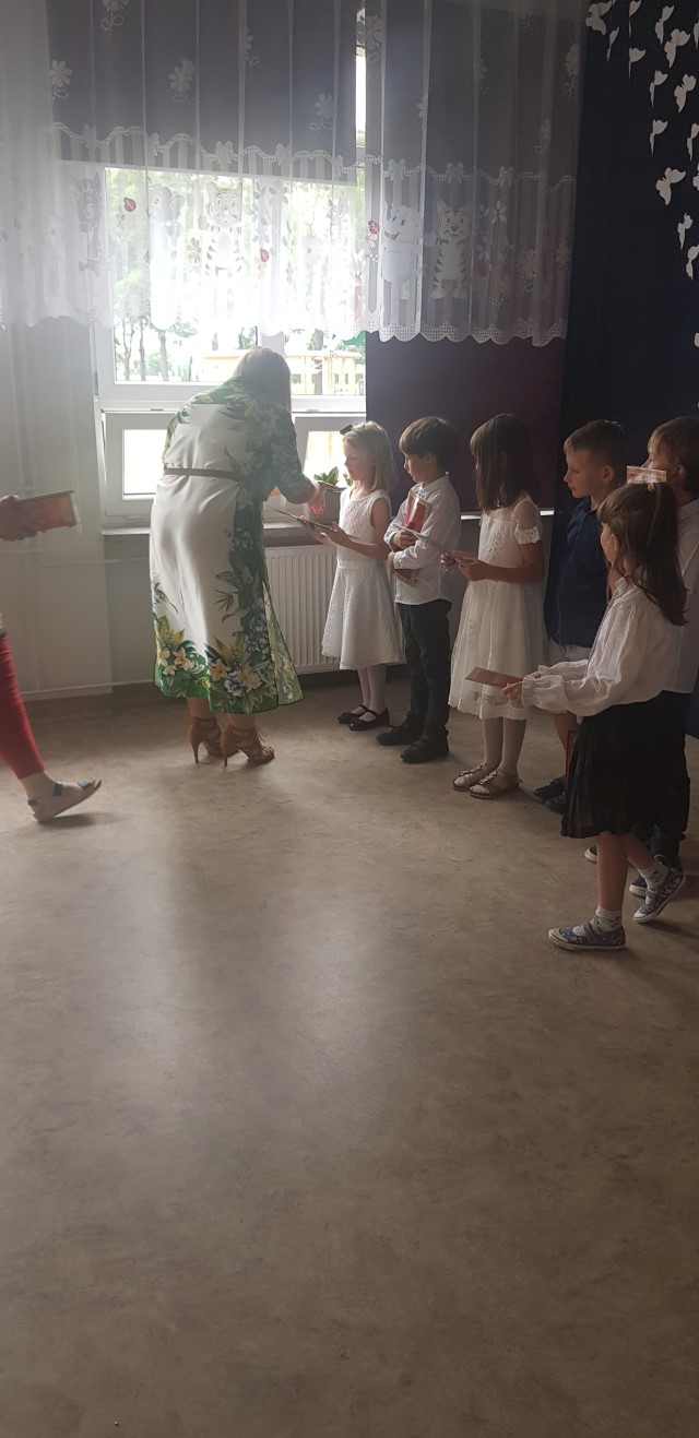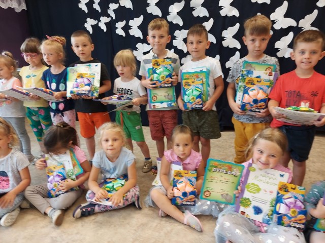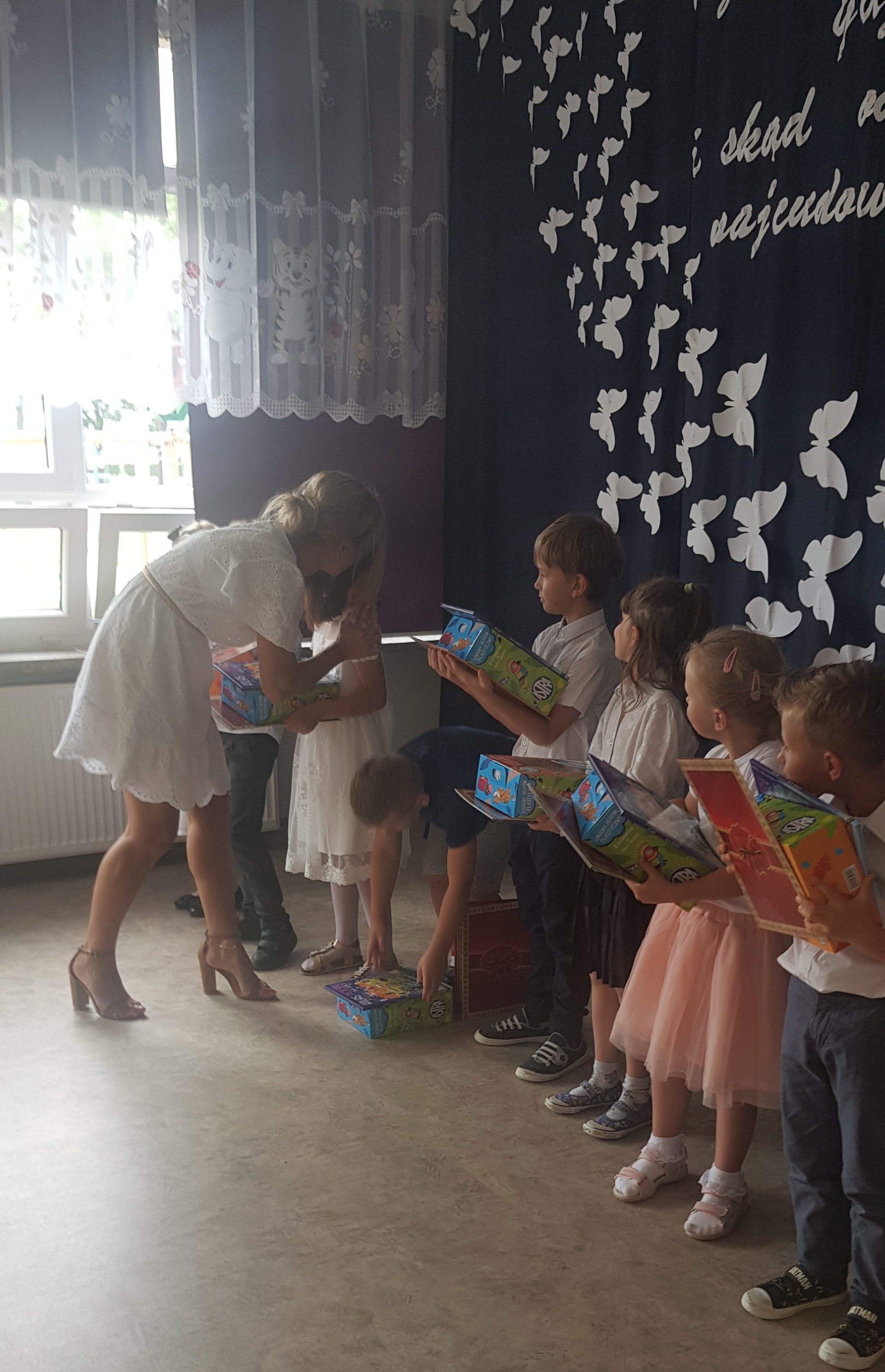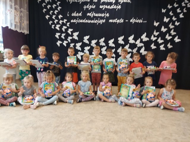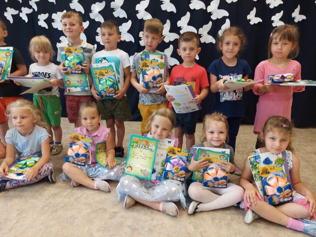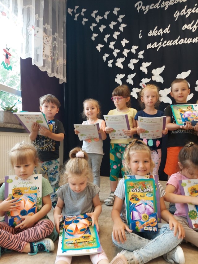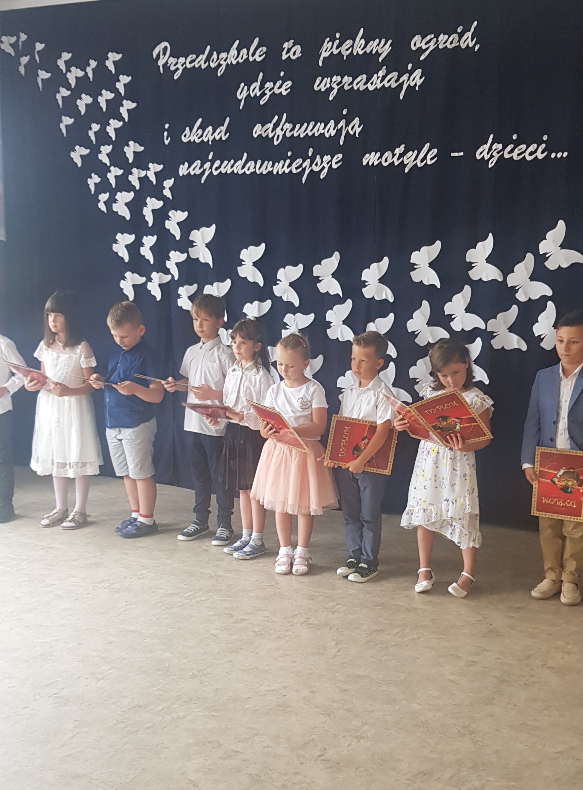 Był to czas niezwykły i niezapomniany, zarówno dla dzieci, rodziców, jak i pań nauczycielek. Skończył się bowiem 4 – letni okres przyjaźni, wspólnych zabaw i spotkań, wspólnej pracy. Dzieci, z maluszków, zagubionych i nieśmiałych, stały się samodzielnymi, odważnymi starszakami, pełnymi pomysłów, ciekawymi świata, chętnymi do podejmowania nowych, coraz trudniejszych zadań. Skończył się beztroski okres i nadszedł czas na przyjęcie innych obowiązków. Przedszkolaki zaprezentowały specjalnie na tę okazję występy artystyczne. Był Polonez, wiersze, tańce i piosenki. Na pamiątkę tego wydarzenia dzieci otrzymały pamiątkowe dyplomy, książki i wyprawkę plastyczną. Były także życzenia i podziękowania ze strony p. Dyrektor oraz Rodziców, nie zabrakło również łez wzruszenia. Ale tak to już jest, coś musi się skończyć, aby móc wejść w kolejny, nowy etap życia. Dziękujemy rodzicom za wspólnie spędzony czas, pomoc i wsparcie, wszystkim przedszkolakom natomiast życzymy udanych wakacji, samych sukcesów w szkole, uśmiechu na co dzień oraz nowych przyjaźni.
