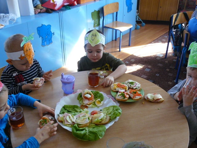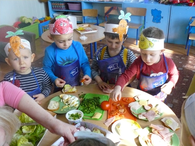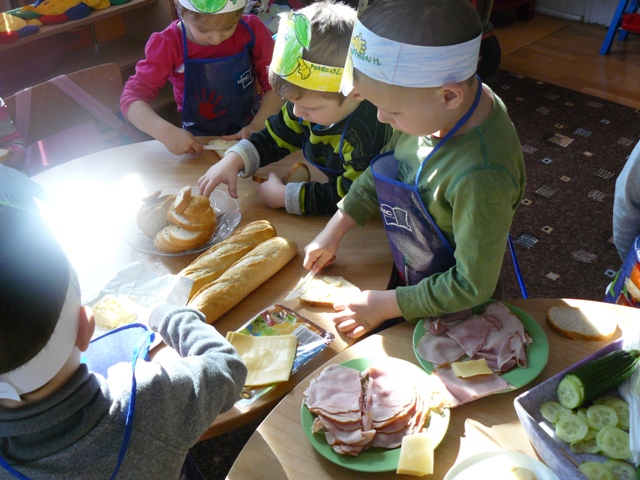Przedszkolaki podjęły wielkie wyzwanie – same miały przygotować dla siebie drugie śniadanie. Przyniosły do przedszkola potrzebne produkty. Na początku przypomniały sobie zasady bezpieczeństwa, których należy przestrzegać podczas posługiwania się nożem. Po starannym umyciu rączek, założeniu fartuszków i przygotowaniu stanowisk pracy wszyscy zabrali się do pracy.Dzieci samodzielnie smarowały pieczywo masłem, a następnie układały na kromkach wybrane przez siebie produkty. Można śmiało powiedzieć, że zadanie wykonały doskonale. Podczas robienia kanapek kształciły odpowiednie nawyki żywieniowe, rozwijały kreatywność, wyobraźnię oraz dbałość o higienę.