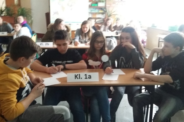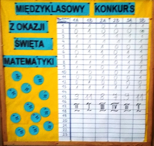 W Polsce pierwsze obchody Dnia Matematyki odbyły się 12 marca 2014 roku z inicjatywy Stowarzyszenia Doskonalenia i Rozwoju 4improve i wzięło w nich udział ponad 100 szkół z całej Polski. Nasza szkoła bierze aktywny udział w obchodach Święta Matematyki zachęcając uczniów do Międzyklasowego Konkursu Matematycznego w formie quizu. W tym roku klasy 1-3 publicznego gimnazjum reprezntowane były przez ochotników. Klasę 1a reprezentowali uczniowie: Paulina Sytnik, Piotr Romanowski, Michał Zagrobelny, Wojciech Woźniak, Wiktoria Klakurka. Klase 1b reprezentowali ochotnicy: Joanna Wiatrowska, Filip Gałęzki, Weronika Kowalcze, Rafał Mroczka i Barbara Stefanik. Klase 2a reprezentowały dwie uczennice: Martyna Pawłowska i Angelika Obacz. Klasę 2b równiez dwie uczennice: Sandra Lipka i Martyna Stefanik. Klase 3a reprezentowałi uczniowie: Kamila Kadłubowska, Magdalena Zalewska, Paulina Farganus i Piotr Zalewski. Klase 3b reprezentowali uczniowie: Kinga Jastrzębska, Kacper Razik, Zbigniew Kuziemski, Kamila Hankus i Urszula Golonka. Wszyscy uczniowie dzielnie walczyli. Ostatecznie zwyciężyli uczniowie klasy 1b i 3b zdobywając 11 punktów, za nimi na miejscu II znalazły się klasy 1a i 3a uzyskując 9 punktów, III miejsce zajęła klasa 2a zdobywając 8 punktów, a miejsce IV przypadło klasie 2b, która uzyskała 7 punktów. Uczniowie otrzymali dyplomy dla swoich klas oraz słodki poczęstunek. Wszystkim serdecznie gratulujemy!!!