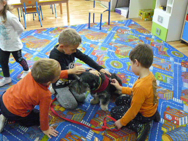 Dnia 4 października 2017 r. dzieci z PP w Krzyżowicach uczestniczyły w spotkaniu z wolontariuszką z przytuliska "Przytul psisko" w Brzegu.Spotkanie miało na celu przybliżenie, oswojenie, uwrażliwienie dzieci na potrzeby zwierząt. Wyrobienie nawyku systematyczności w opiece nad nimi poprzez uświadomienie wszelkich ich potrzeb. Podczas spotkania przedszkolaki dowiedziały się, jak należy dbać o zwierzęta, co to za miejsce – przytulisko oraz jak można pomóc zwierzętom tam mieszkającym. Dodatkowo poznaliśmy „mowę ciała psa”, wiemy po czym rozpoznać czy piesek jest zły czy gotowy do zabawy. Przedszkolaki chętnie brały udział w zabawach organizowanych przez wolontariuszkę. Na zakończenie spotkania dzieci przekazały dla podopiecznych przytuliska karmę dla piesków i kotków. Spotkanie z wolontariuszką dostarczyło dzieciom wiele radości. Serdecznie dziękujemy Pani Aldonie za niezwykle ciekawe spotkanie.