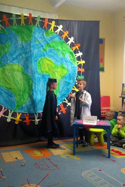 Dnia 25.04.2017 r. grupa starszaków zaprosiła swoich rodziców i zaprzyjaźnionych gości na przedstawienie ekologiczne pt. „Dla Ziemi, dla siebie- zostań przyjacielem przyrody”. Miesiąc kwiecień to szczególny dzień, gdyż właśnie w kwietniu obchodzimy Światowy Dzień Ziemi. Dzieci przez cały rok poznały wiele sposobów ochrony przyrody. Cechuje ich wielka świadomość ekologiczna. Znają wiele sposobów ochrony przyrody oraz negatywnych zachowań prowadzących do jej niszczenia. Przedstawienie ekologiczne miało przypomnieć wszystkim zebranym o konieczności ochrony naszej planety, a wiersze i piosenki o tematyce ekologicznej wykorzystane w przedstawieniu miały o tym przypominać. Na zakończenie przedstawienia widzowie otrzymali pamiątkowe zielone drzewa wykonane przez dzieci, które miały symbolizować naszą zieloną planetę.