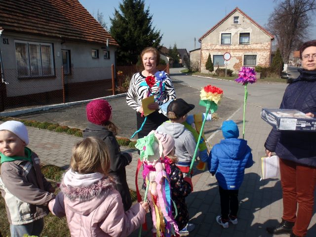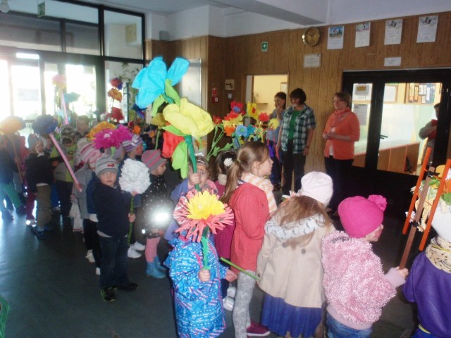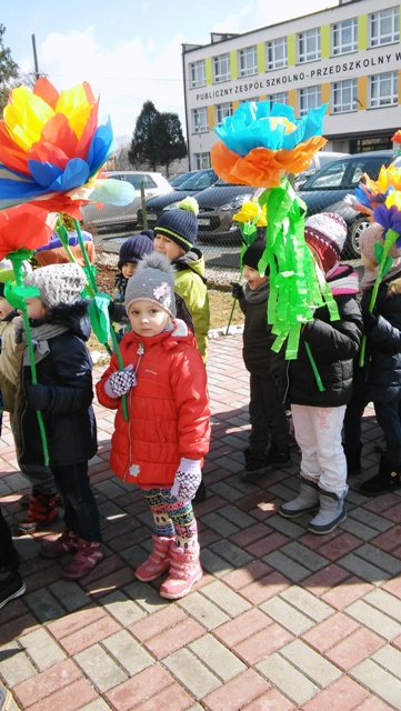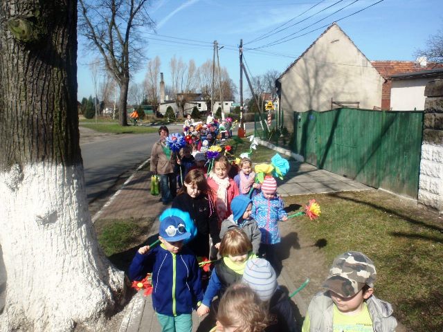 W pierwszy dzień Wiosny dzieci przybyły do przedszkola w radosnych nastrojach. Piękne i kolorowe stroje, wiosenne emblematy miały zaakcentować nową porę roku. Przedszkolaki z kukłą Marzanny i Panią Wiosną, ruszyły barwnym orszakiem po okolicy, aby wierszem i piosenką powitać nową porę roku. Z wiosennymi życzeniami odwiedziły także miejscowe instytucje oraz lokalne firmy. Głośnymi okrzykami przywoływały upragnioną wiosnę.